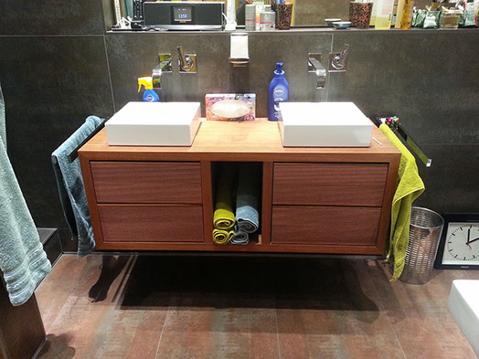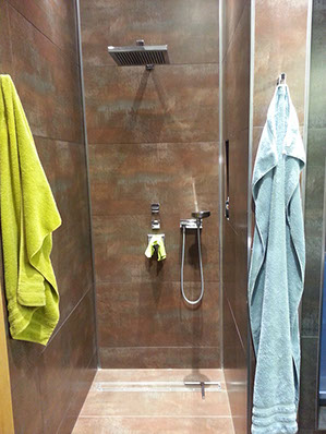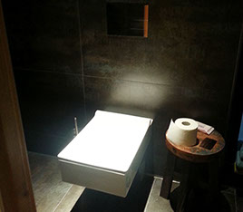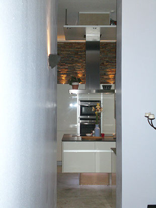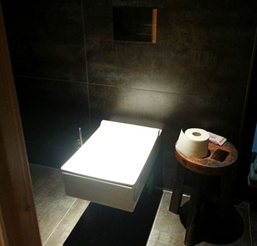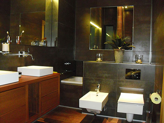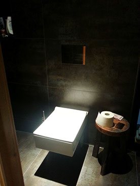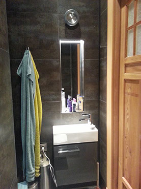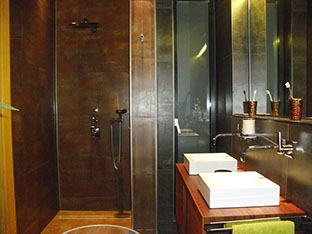 Der Sanitärtrakt einer 125m² Wohnung wurde komplett abgebrochen und neu geplant. Ein zusätzliches Gäste-WC mit Dusche und ein Abstellraum mit WaMa /Trockner eingefügt. Das Hauptbad wurde im Stil der japanischen Tempelbautradition entwickelt für eine komfortable Nutzung auf kleinstem Raum. Es wurden bodentiefe Fenster zum Lichtschacht eingebaut, sämtliche Abwasserrohre zwischen Gäste-WC und Hauptbad in den Lichtschacht verlegt um keine störenden Sockel sehen zu müssen. Ein zusätzliches Bidet ist hier mit neuer Bodenheizung und einer aufwändigen Lichtsteuerung zum Ort der Ruhe und des Besinnens eingerichtet worden.