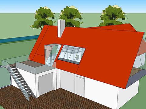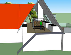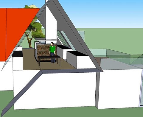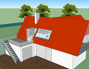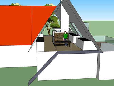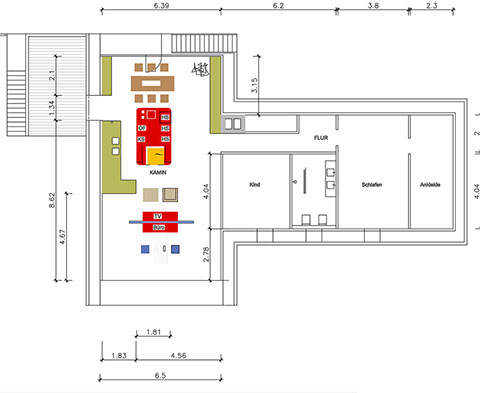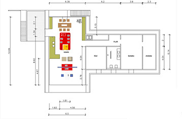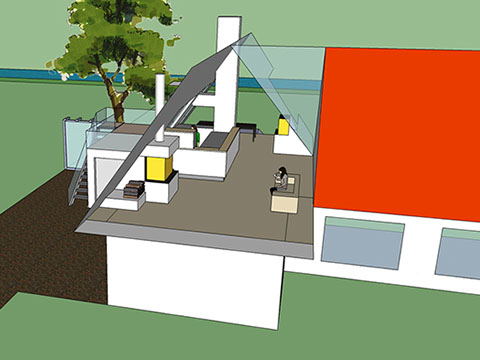 Eine zusätzliche Erschließung für das OG wird über die bestehende Garage geführt. Hier wird der zentrale Wohnbereich mit Essplatz, Couchecke, Kamin und einer offenen Küche neu definiert.