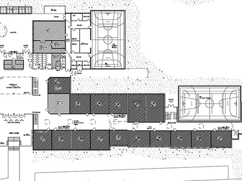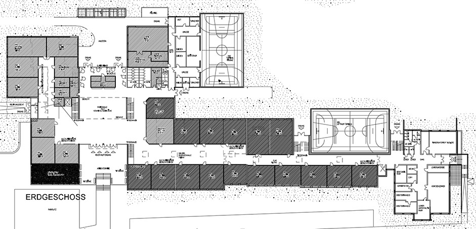 Aus zwei angrenzenden Schulen soll ein zusammenhängender Gesamtkomplex geschaffen werden. Die Aula ist möglichst zu verbessern und den neuen Bedürfnissen anzupassen.