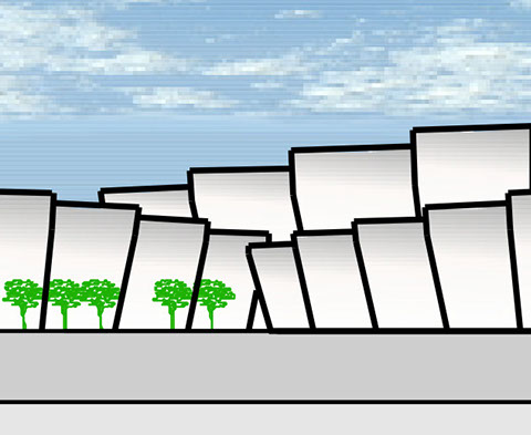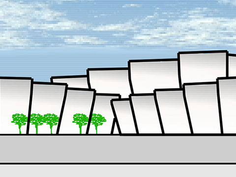 Die Baukörper sind in einer schalenförmigen Segmentbauweise in konstruiert. Das ermöglicht in den Versatz Tageslicht in das Rauminnere zu leiten und zu einer homogenen und eine adaptive Fassadenstruktur zu erreichen, die für alle unterschiedlichen Gebäudegrößen anwendbar ist.