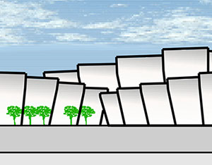 Die Gebäude werden quer zur Fließrichtung des Wassers gestellt, um die Beziehung zu den am Ufer gelegenen Stadtteilen für jeden Betrachter erlebbar zu machen.