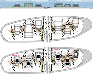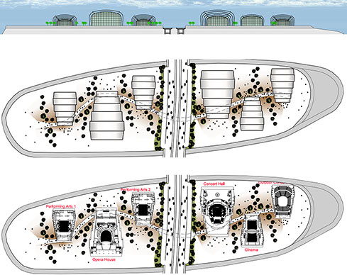 Auf einer Insel im Fluss soll eine Veranstaltungsfläche mit diversen Gebäuden wie ein Konzerthaus, eine Arena für Tanzshows und Darstellende Künste entstehen.
